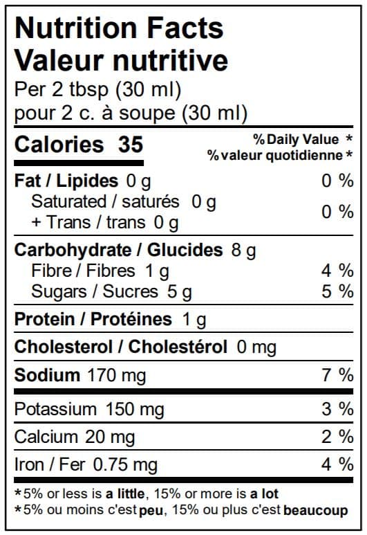 Ingredients: Tomato puree (tomatoes, salt), Ketchup (tomato paste, sugar, vinegar, salt, onion powder, spices), Sugars (orange juice), Onion powder, Cumin, Garlic powder, Chili powder, Mustard powder, Oregano, Black pepper.