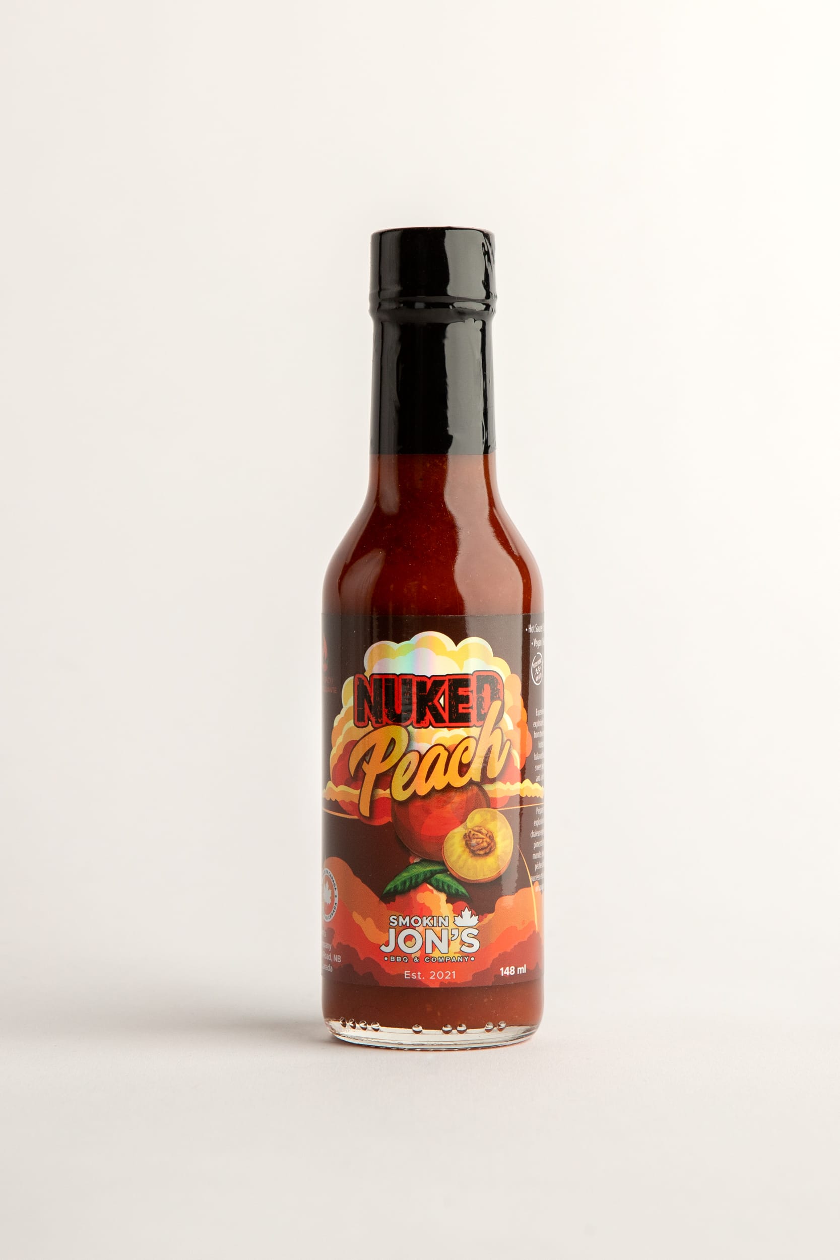 Ingredients: Peaches (peaches, malic acid, citric acid), Hot pepper puree (Carolina Reaper, salt), Ghost pepper powder, Sugars (orange juice, Demerara-style sugar), Cider vinegar, Water, Lime juice from concentrate (water, concentrated lime juice, sulphites, lime oil), Lemon juice from concentrate (water, concentrated lemon juice, sulphites, lemon oil), Garlic powder, Onion powder, Paprika, Chili pepper powder, Flavour, Smoked vegetable oil.